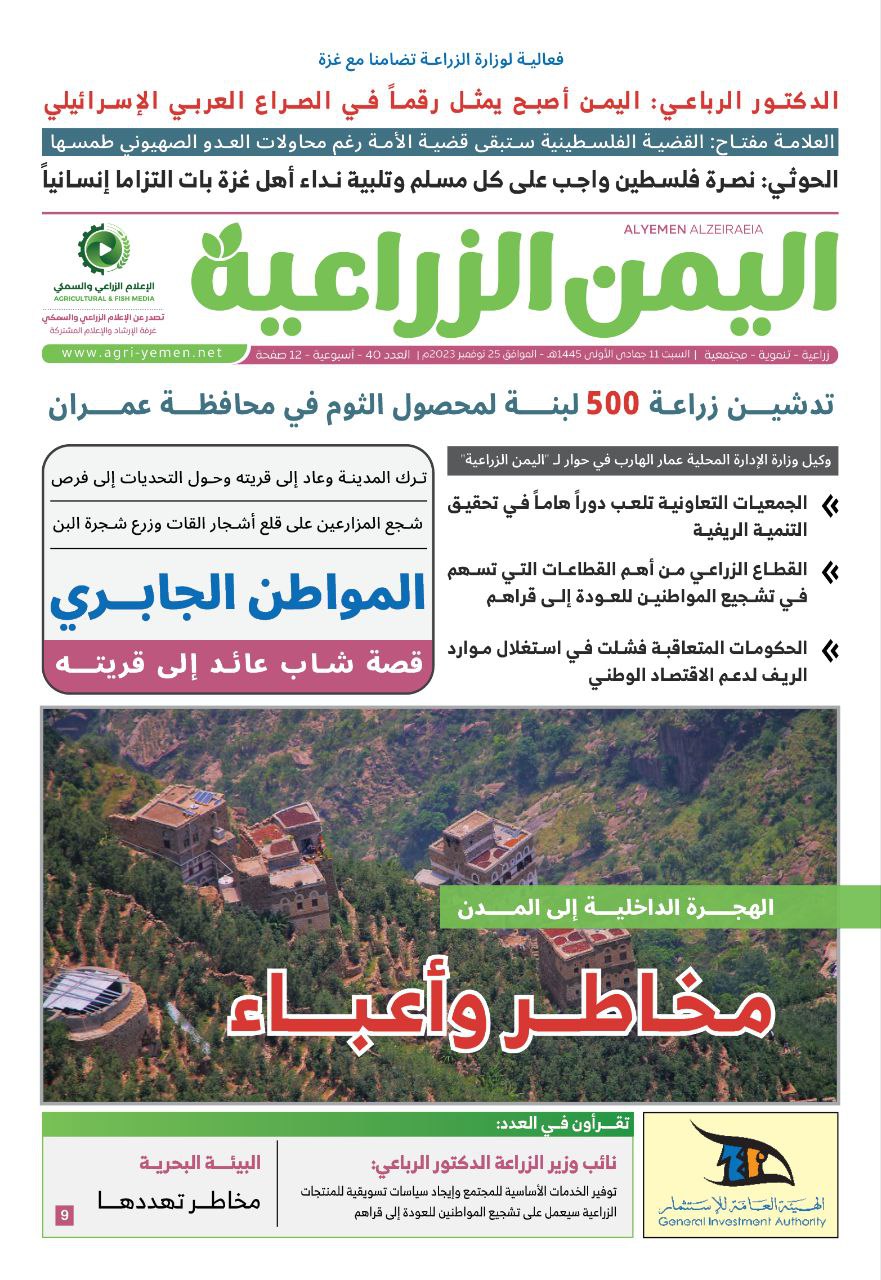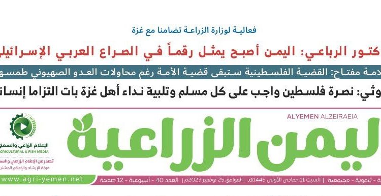 صدر اليوم عدد جديد من الصحيفة “اليمن الزراعية” العدد الـ (40) متضمنة عدد من العناوين والمواضيع والتقارير الزراعية عن النشاط الزراعي والسمكي خلال الفترة الماضية.