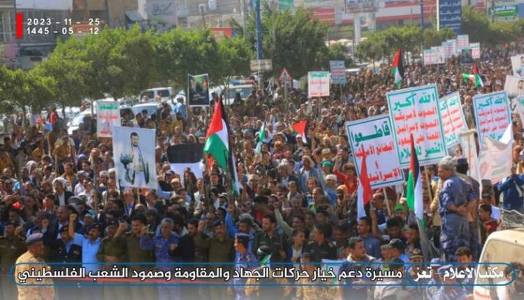 مسيرة حاشدة بمحافظة تعز تدعم خيارات الجهاد والمقاومة وصمود الشعب الفلسطيني