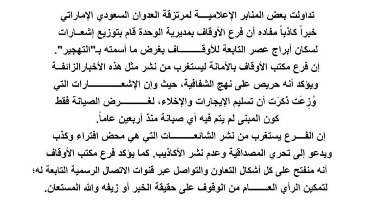 تداولت بعض المنابر الإعلامية لمرتزقة العدوان السعودي الإماراتي، خبراً كاذباً مفاده أن فرع الأوقاف بمديرية الوحدة قام بتوزيع إشعارات لسكان أبراج عصر التابعة للأوقاف بغرض ما أسمته بـ”التهجير”.