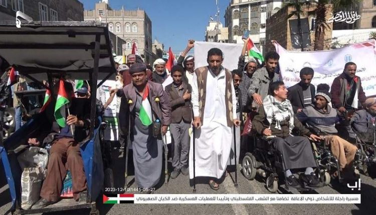 نظم اليوم الإتحاد الوطني لجمعيات المعاقين اليمنيين وصندوق رعاية وتأهيل المعاقين بمحافظة إب، مسيرة رمزية للمعاقين من المحافظة تضامنا مع الشعب الفلسطيني وقطاع غزة.