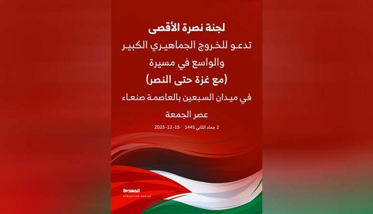 دعت اللجنة الوطنية لنصرة الأقصى للخروج الجماهيري الكبير والواسع بالعاصمة صنعاء والمحافظات في مسيرة (مع غزة حتى النصر) اليوم الجمعة.