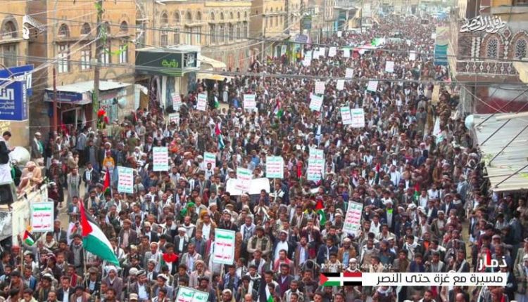 احتشد أبناء محافظة ذمار، اليوم الجمعة، في مسيرة جماهيرية تأكيدا على الوقوف إلى جانب أبناء الشعب الفلسطيني حتى تحقيق النصر.