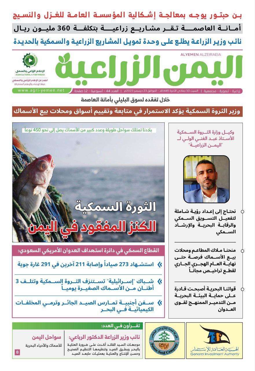 صدر العدد “44” من صحيفة “اليمن الزراعية، متضمناً عدداً من الملفات الزراعية وعلى وجه الخصوص في القطاع السمكي والكنز اليمني المفقود لعقود من الزمن.