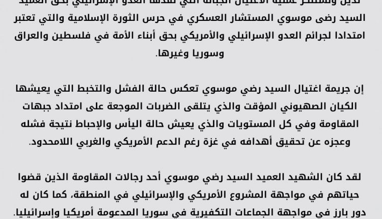 وعبر البيان عن التعازي للجمهورية الإسلامية الإيرانية قيادة وشعبا وذوي الشهيد رضا موسوي.