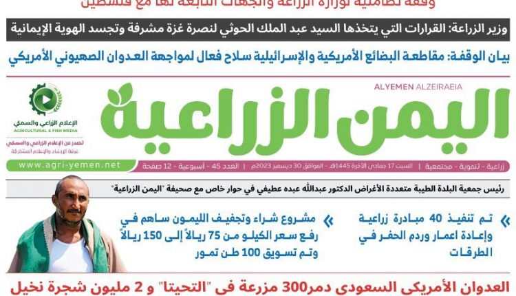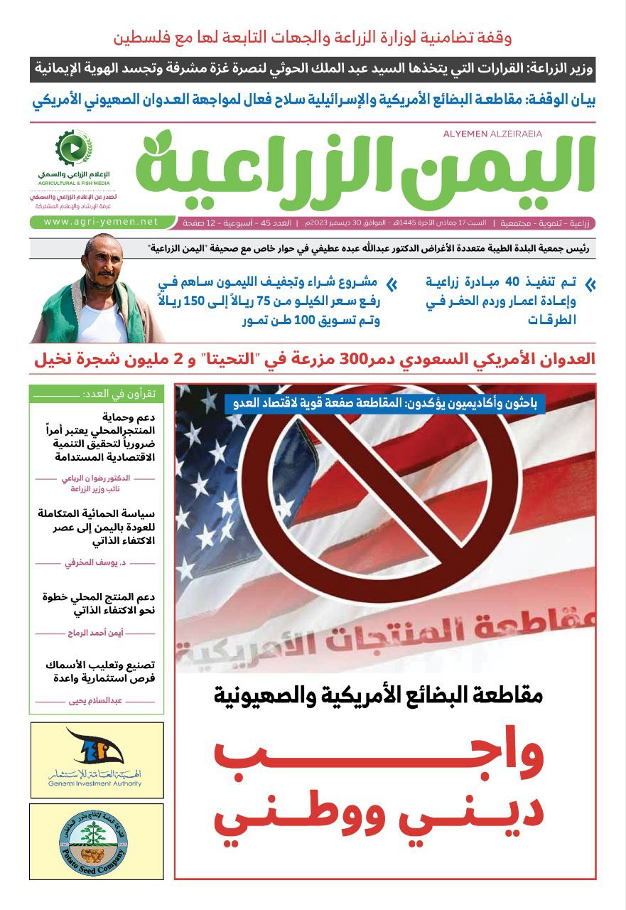 صدر العدد العدد “45” من صحيفة “اليمن الزراعية” متضمناً عناوين بارزة في أهمية تفعيل سلاح المقاطعة للمنتجات الأمريكية والإسرائيلية وتشجيع المنتج المحلي.