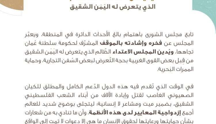 أدان مجلس الشورى العماني الاعتداء الظالم الذي يتعرض له اليمن من قبل بعض القوى الغربية بحجّة التعرّض لبعض السفن التجارية وحماية الممرات البحرية