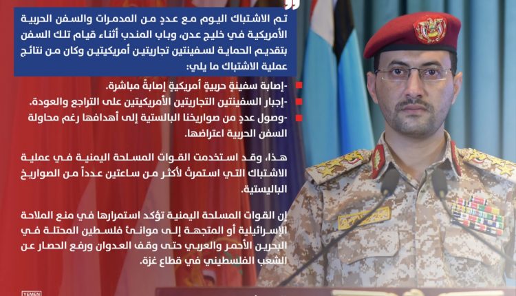 بيان القوات المسلحة بشأن الاشتباك مع عدد من المدمرات والسفن الحربية الأمريكية في #خليج_عدن، و #باب_المندب بيان القوات المسلحة بشأن الاشتباك مع عدد من المدمرات والسفن الحربية الأمريكية في خليج عدن وباب المندب بيان القوات المسلحة بشأن الاشتباك مع عدد من المدمرات والسفن الحربية الأمريكية في خليج عدن وباب المندب On يناير 25, 2024 Share يمني برس- انفوجرافيك بيان القوات المسلحة بشأن الاشتباك مع عدد من المدمرات والسفن الحربية الأمريكية في #خليج_عدن، و #باب_المندب Share