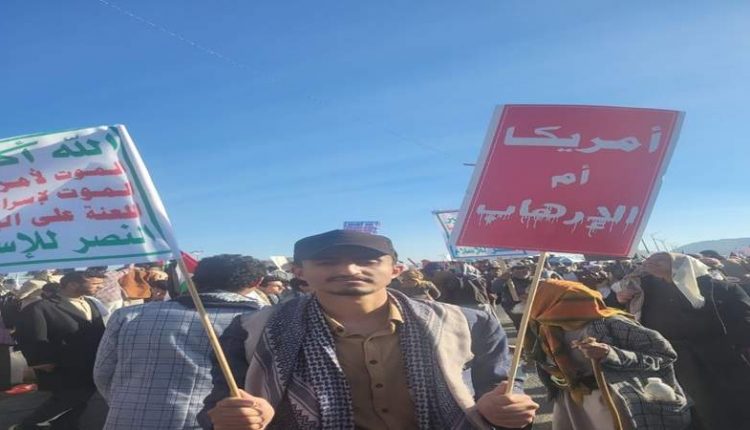 من بين الحشود أَيْـضاً كان مالك السرحي، يحمل على كتفيه لوحة مكتوب عليها “أمريكا أم الإرهاب” وشعار الصرخة (الموت لأمريكا، الموت لإسرائيل، اللعنة على اليهود، النصر للإسلام).
