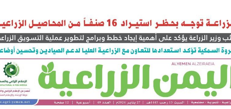 صدر عدد جديد من الصحفية الأسبوعية “اليمن الزراعية” تضمن العدد جملة من التقارير الإعلامية الزراعية والسمكية، أضافة إلى متابعات إخبارية لجملة من الأنشطة الزراعية للفترة الماضية.