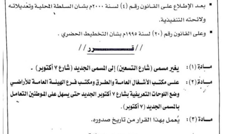 ووجه المحافظ مكتب الأشغال والطرق بوضع اللوحات التعريفية بشارع 7 ـأكتوبر حتى يسهل على المواطنين التعامل مع التسمية الجديدة.