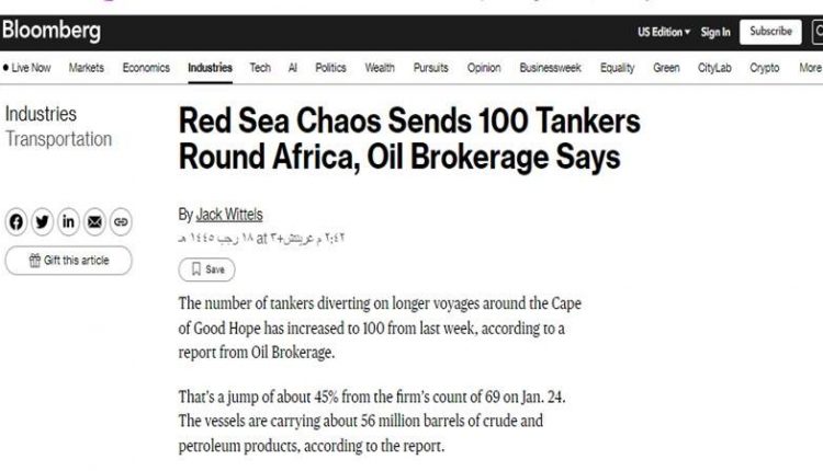 ذكرت وكالة “بلومبرغ” الأمريكية، اليوم الثلاثاء، أنّ عدد الناقلات التي تحوّل رحلاتها الطويلة حول رأس الرجاء الصالح ارتفع إلى 100 مقارنةً بالأسبوع الماضي.