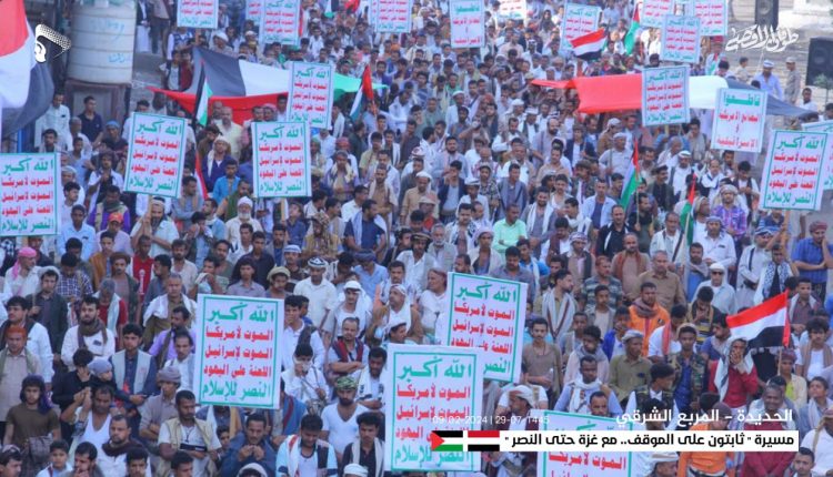 مسيرات كبرى بمحافظة الحديدة نصرة للشعب الفلسطيني ومواجهة للعدوان الأمريكي البريطاني