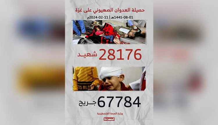 وأكدت ارتفاع حصيلة العدوان الصهيوني على القطاع المحاصر إلى 28176 شهيدًا و 67784 جريحًا منذ السابع من أكتوبر الماضي.