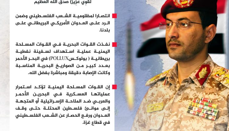 بيان القوات المسلحة اليمنية بشأن عملية استهداف سفينة بريطانية " بولوكسPOLLUX " في #البحر_الأحمر انفو.. بيان القوات المسلحة بشأن قصف سفينة النفط بريطانية “بولوكسPOLLUX “ انفو.. بيان القوات المسلحة بشأن قصف سفينة النفط بريطانية “بولوكسPOLLUX “ Last updated فبراير 17, 2024 Share يمني برس- انفوجرافيك بيان القوات المسلحة اليمنية بشأن عملية استهداف سفينة بريطانية ” بولوكسPOLLUX ” في #البحر_الأحمر Share
