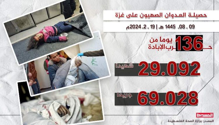 وأعلنت ارتفاع حصيلة ضحايا العدوان الصهيوني المتواصل على قطاع غزة المحاصر منذ 136 يوما إلى 29.092 شهيداً و69.028 جريحاً.