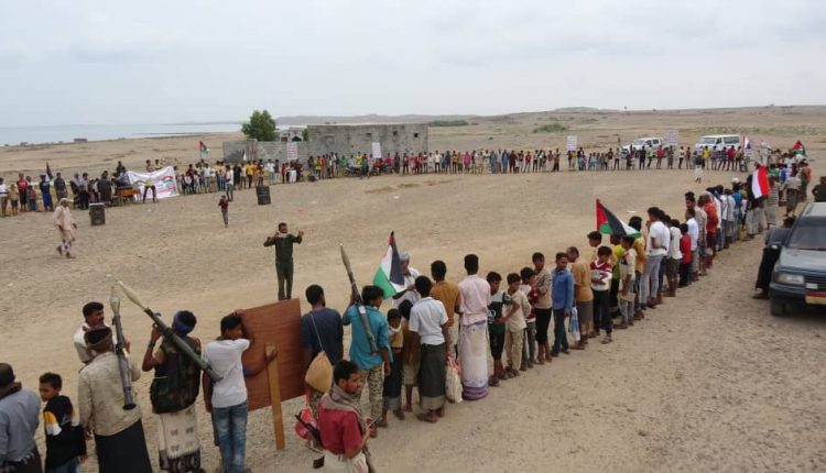 نظمت في منطقة رأس عيسى بمديرية الصليف في محافظة الحديدة، اليوم، وقفة لإعلان النفير في مواجهة العدوان الأمريكي البريطاني وتأكيدا على استمرار التضامن مع الشعب والمقاومة الفلسطينية.
