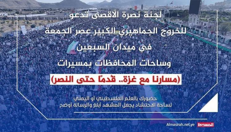 ودعت لجنة نصرة الأقصى جميع أبناء الشعب اليمني إلى المشاركة الفاعلة في هذه المسيرات، للتعبير عن غضبهم واستنكارهم للعدوان الإسرائيلي، وإيصال رسالة دعم ومساندة للشعب الفلسطيني في قطاع غزة.