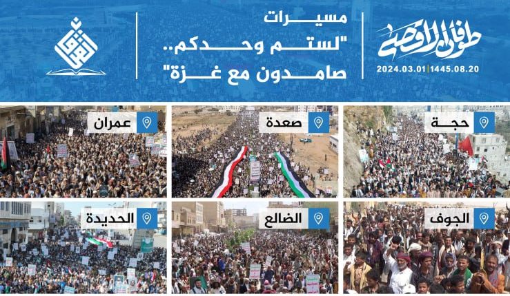 خروج جماهيري مليوني في مختلف المحافظات للمشاركة في مسيرات “لستم وحدكم.. صامدون مع غزة” On مارس 2, 2024 Share يمني برس| خروج جماهيري مليوني في مختلف المحافظات للمشاركة في مسيرات “لستم وحدكم.. صامدون مع غزة” Share