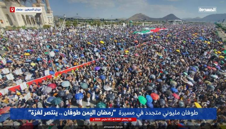 مسيرات مليونية في صنعاء والمحافظات إسنادا للشعب الفلسطيني تحت شعار (رمضان اليمن.. طوفان ينتصر لغزة)
