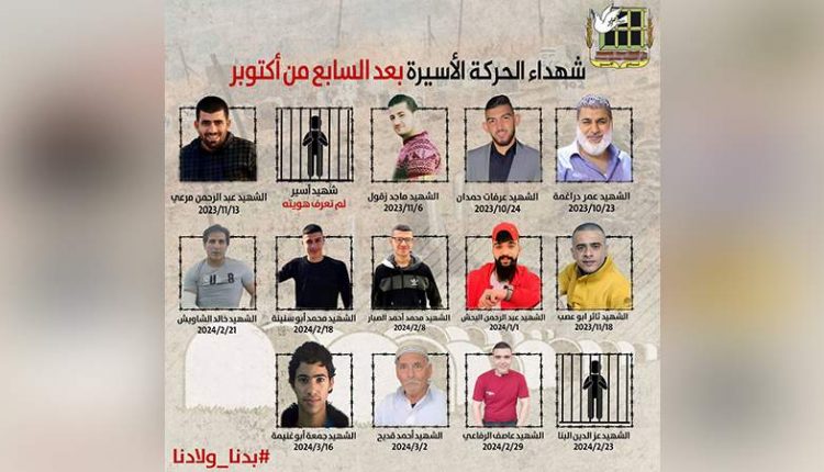ارتفع عدد شهداء الأسرى الفلسطينيين في سجون العدو الصهيوني منذ السابع من أكتوبر الماضي إلى 14 شهيدًا.