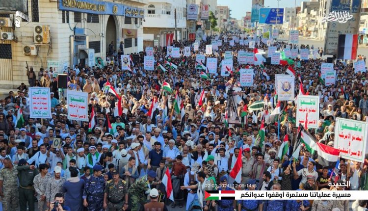 شاهد بالصور.. حشود جماهيرية كبرى في 20 ساحة بالحديدة في مسيرات “عملياتنا مستمرة.. أوقفوا عدوانكم”
