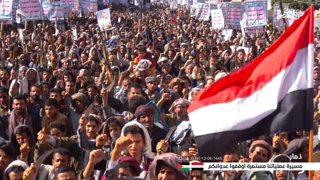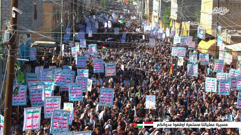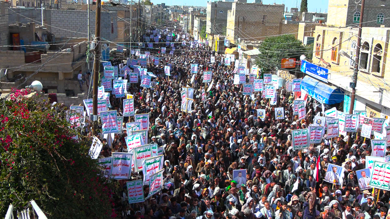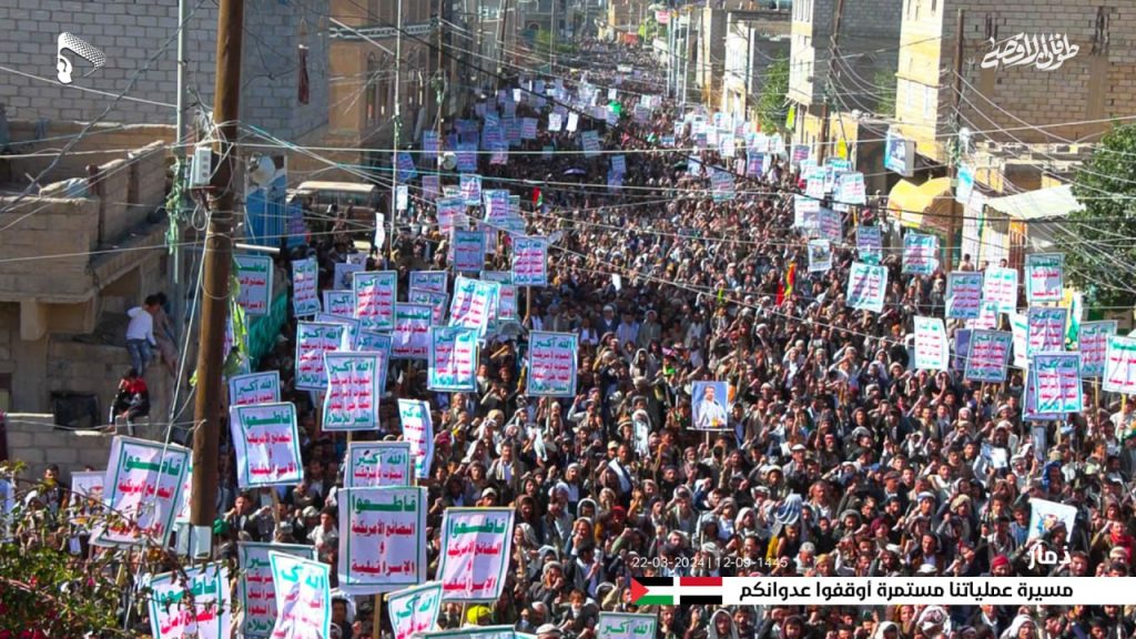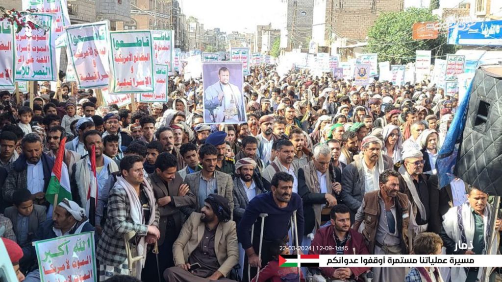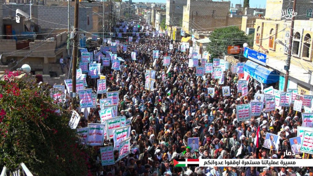 وخلال المسيرة في مدينة ذمار، ردد المشاركون الهتافات والشعارات المنددة باستمرار الجرائم الوحشية والمجازر المدوية بحق الشعب الفلسطيني المظلوم، من قتل، وحصار، وتجويع، وإهانة، وإذلال وامتهان للكرامة الإنسانية، واستباحة للحرمة الآدمية، في ظل صمت دولي، وتواطؤ أممي، وخذلان عربي وإسلامي.
