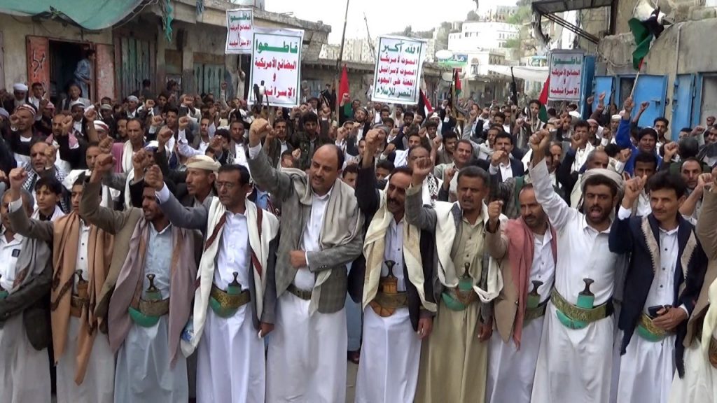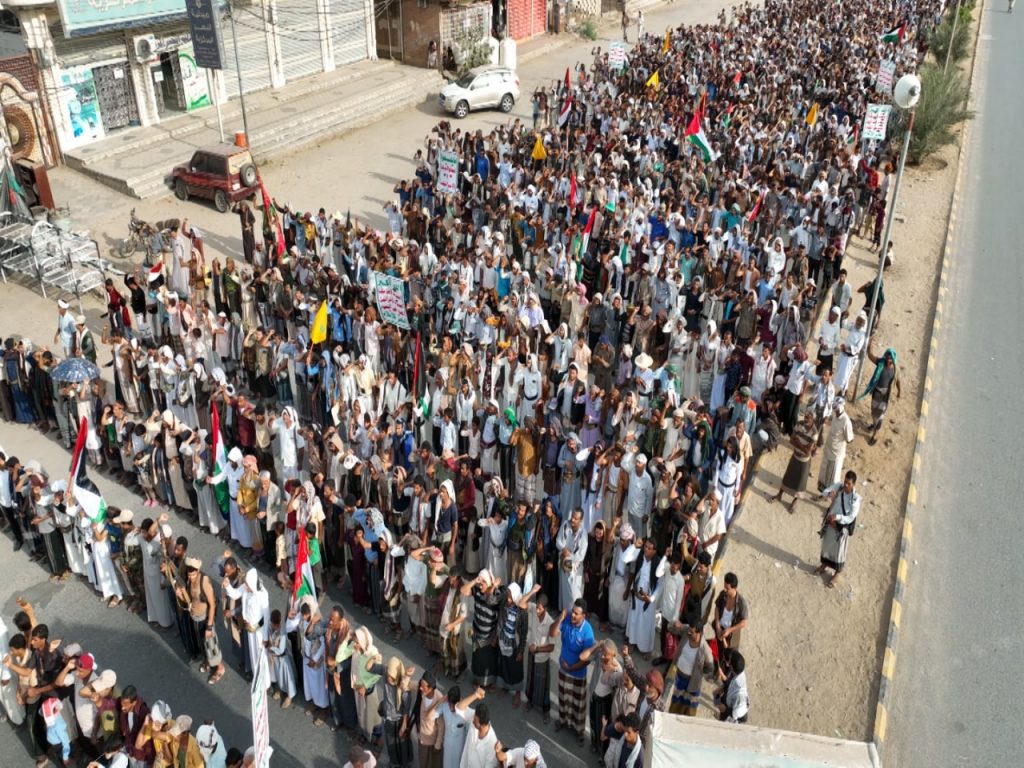 ورفعت الجماهير الحاشدة العلمين اليمني والفلسطيني واللافتات المناهضة لأمريكا وإسرائيل والمنددة بالجرائم الوحشية ومجازر الإبادة الجماعية التي يرتكبها العدو الصهيوني بحق الأطفال والنساء والمدنيين في قطاع غزة وفلسطين المحتلة، بدعم أمريكي غربي وتواطؤ عربي مخجل .