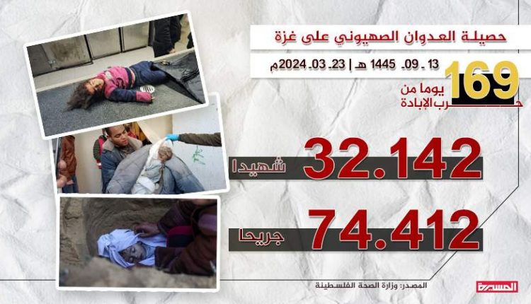 وأوضحت الوزارة أن حصيلة العدوان الصهيوني على غزة منذ السابع من أكتوبر ارتفعت إلى 32.142 شهيدا و74.412 إصابة.