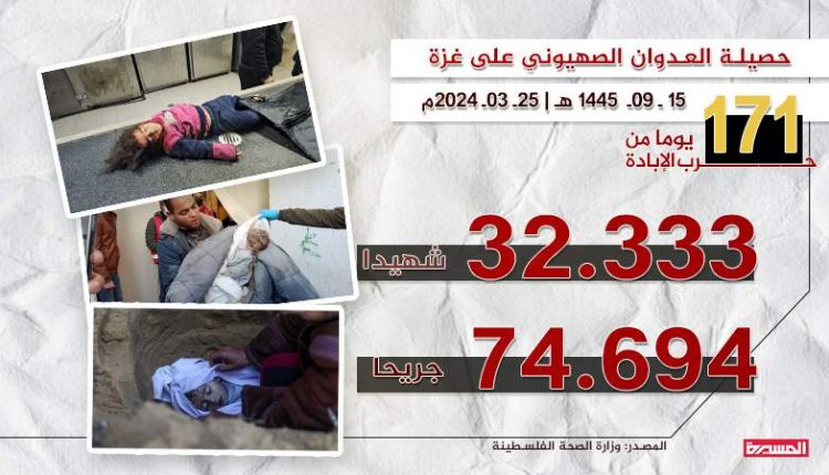 وأوضحت الوزارة أن حصيلة العدوان الصهيوني على غزة منذ السابع من أكتوبر ارتفعت إلى 32.333 شهيدا و74.694 إصابة.