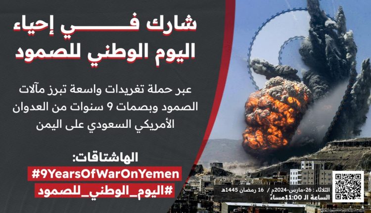 ودعا منظمو الحملة، الناشطين وأحرار العالم إلى المشاركة الواسعة في حملة التغريدات بمناسبة اليوم الوطني للصمود في وجه العدوان، لإبراز مآلات الصمود ومظاهر تسع سنوات من العدوان الأمريكي السعودي على اليمن وذلك على الهاشتاقات:
