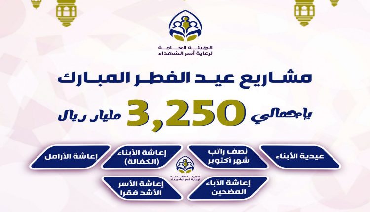 وأكد الجرادي أن الهيئة سبق وصرفت نصف راتب لأسر الشهداء والمفقودين بمبلغ مليار و200 مليون ريال عبر الحوالات السريعة، مبيناً أن مشاريع عيد الفطر تأتي في إطار حزمة من المشاريع الرعائية التي نفذتها الهيئة خلال شهر رمضان لجميع أسر الشهداء والمفقودين بإجمالي 12 ملياراً و300 مليون ريال.