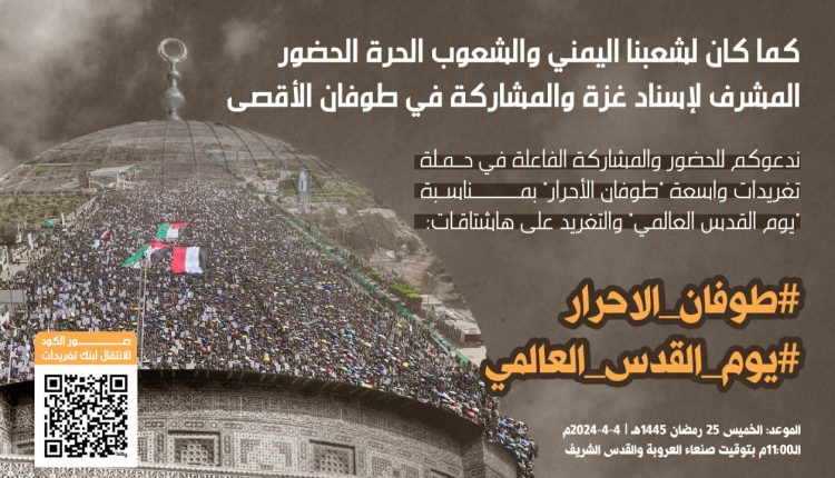 تنطلق في الساعة الـ11 من مساء اليوم الخميس بتوقيت صنعاء والقدس الشريف حملة تغريدات “طوفان الأحرار” على موقع التواصل الاجتماعي “x” بمناسبة يوم القدس العالمي.