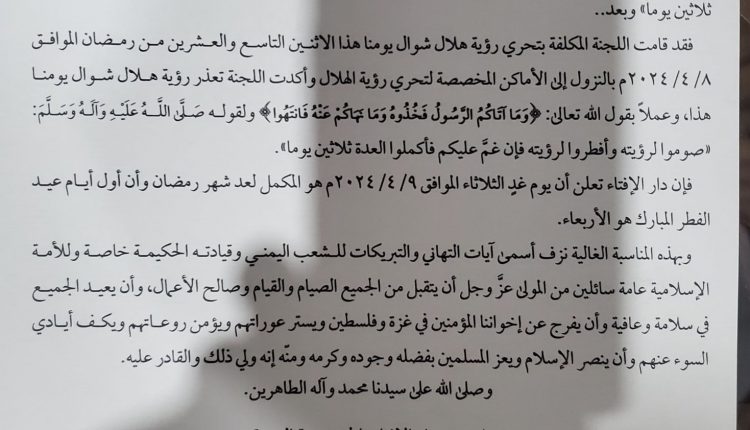 دار الإفتاء اليمنية تعلن موعد أول أيام عيد الفطر المبارك “وثيقة”