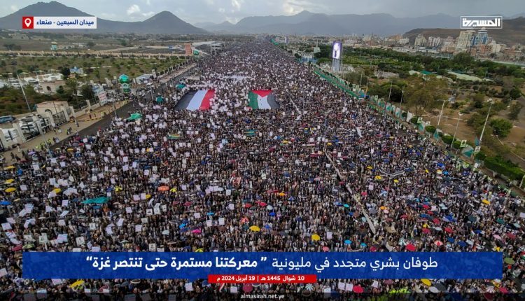 شهد ميدان السعبين بالعاصمة صنعاء، اليوم الجمعة، طوفانا بشريا متجددا نصرة للشعب الفلسطيني تحت شعار (معركتنا مستمرة حتى تنتصر غزة).