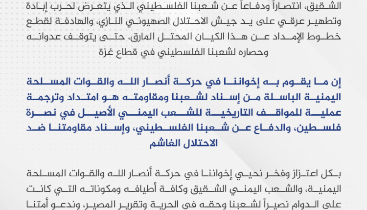وأضافت” بكل اعتزاز وفخر نحيي إخواننا في حركة أنصار الله والقوات المسلحة اليمنية، والشعب اليمني الشقيق وكافة أطيافه ومكوناته التي كانت على الدوام نصيراً لشعبنا وحقه في الحرية وتقرير المصير”.