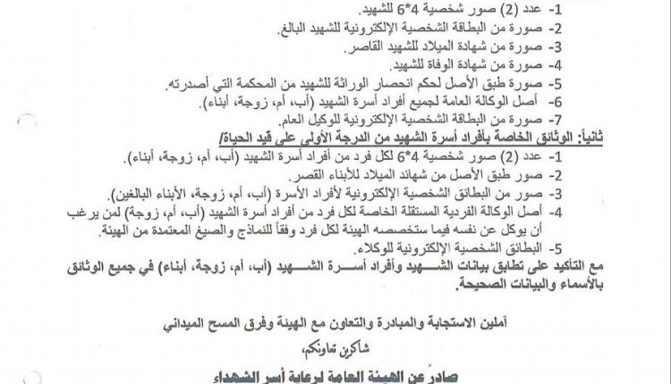 ودعت الهيئة جميع أسر الشهداء المدنيين إلى تجهيز وثائقهم المطلوبة وتسليمها لمندوبي الهيئة في المحافظات والمديريات والعزل التي يتواجدون فيها.