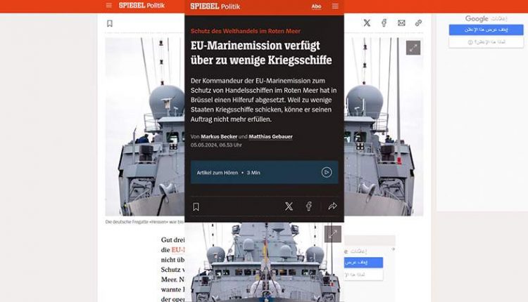 كشفت صحيفة ألمانية أنه، بعد مرور ثلاثة أشهر على إطلاقها، لم يعد لدى مهمة الاتحاد الأوروبي “أسبيدس” “Eunavfor Aspides” ما يكفي من السفن الحربية في البحر الأحمر.