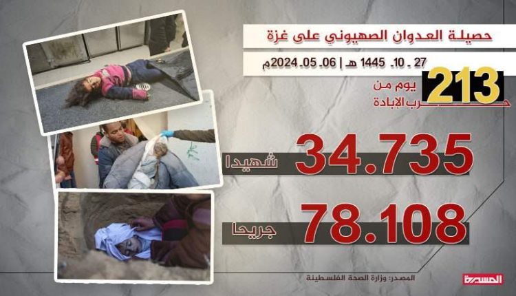 وأعلنت الوزارة: ارتفاع حصيلة العدوان الإسرائيلي على القطاع إلى 34735 شهيدا و78108 إصابة منذ السابع من أكتوبر الماضي.