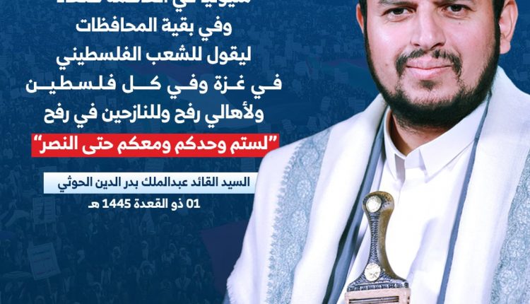 وقال قائد الثورة في كلمته اليوم بمناسبة آخر التطورات والمستجدات: (أدعو شعبنا العزيز إلى الخروج يوم الغد خروجا مليونيا في العاصمة #صنعاء وفي بقية المحافظات ليقول للشعب الفلسطيني في #غزة وفي كل فلسطين ولأهالي #رفح وللنازحين في رفح “لستم وحدكم ومعكم حتى النصر”)