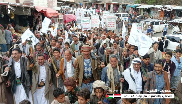 حيث نُظمت بمديريات مدينة المحويت وشبام كوكبان “بالجامع الكبير وسوق بادية” والطويلة والرجم بـ”ساحة الرسول الأعظم” وسهل باقل والخبت “المرواح ومنطقة الظاهر” وبني سعد بـ”مركز المديرية” وملحان “بني الحجاج والروضة” والشجاف وجبل المحويت “العرقوب وسوق الأحد والاحجول” وحفاش بـ”مركز المديرية الصفقين والملاحنة مسيرات تضامنية مع الشعب الفلسطيني وما يتعرض له من جرائم يندى لها الجبين من قبل الكيان الصهيوني.