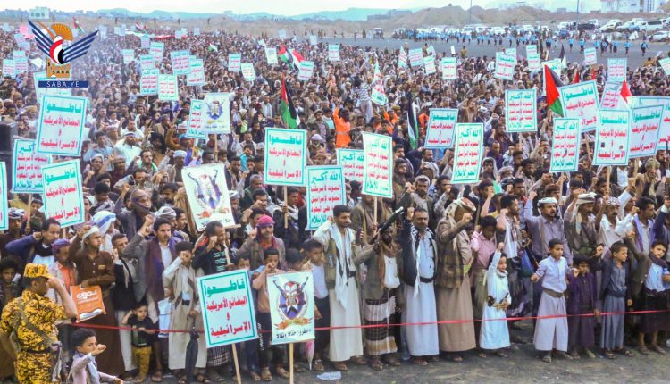وفي المسيرة التي أقيمت في ساحة الرسول الأعظم بمديرية التعزية، بمشاركة القائم بأعمال المحافظ أحمد المساوى، وأركان حرب المنطقة العسكرية الرابعة قائد اللواء 22 ميكا اللواء ركن حمود دهمش، وعدد من وكلاء وقيادات المحافظة، أكدت الحشود الاستمرار في التصعيد ضد الكيان الصهيوني الأمريكي البريطاني نصرة للشعب الفلسطيني.