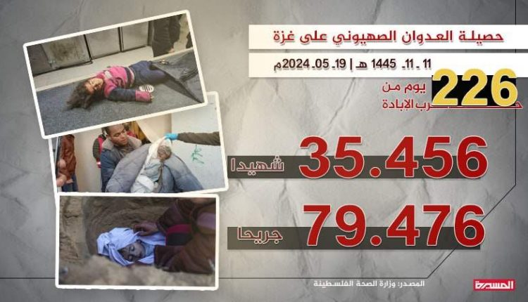 وأوضحت أن حصيلة العدوان الإسرائيلي المستمر منذ 7 أكتوبر2023، ارتفعت إلى 35456 شهيدًا، و79476 مصابًا.