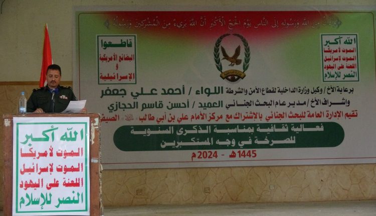 أحييت الإدارة العامة للبحث الجنائي، اليوم، بمشاركة مع طلاب مركز الإمام علي عليه السلام، بمديرية التحرير بالعاصمة صنعاء، فعالية ثقافية بمناسبة الذكرى السنوية للصرخة للعام 1445 هجرية.