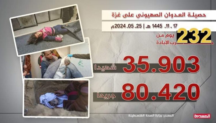 وارتفعت حصيلة العدوان الصهيوني المستمر على قطاع غزة منذ الـ 7 من أكتوبر 2023 الماضي إلى 35 ألفًا و903 شهداء، بالإضافة لـ 80 ألفًا و420 مصابًا بجراح متفاوتة؛ بينها خطيرة وخطيرة جدًا.
