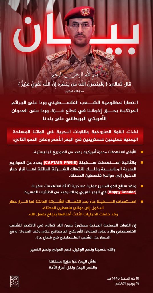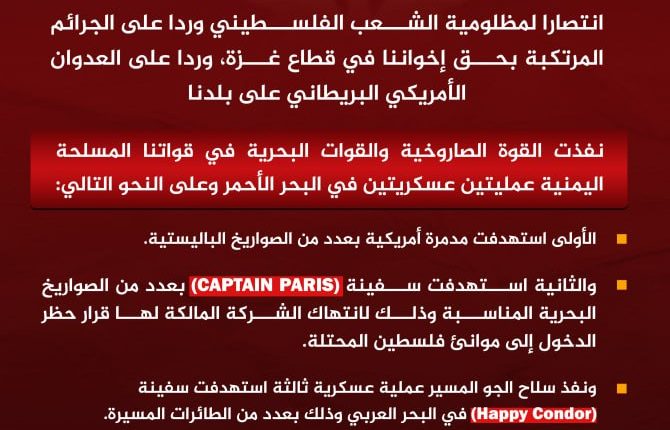 بيان القوات المسلحة اليمنية بشأن تنفيذ 3 عمليات عسكرية استهدفت مدمرة أمريكية وسفينتين في البحرين الأحمر والعربي (إنفوجرافيك)