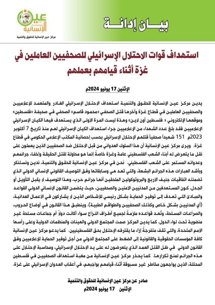 وأكد مركز عين الإنسانية، في بيان صادر عنه، أن هذه ليست المرة الأولى الذي يستهدف فيها الكيان الإسرائيلي الإعلاميين فقد بلغ عدد الشهداء من الإعلاميين جراء استهداف الكيان الإسرائيلي لهم منذ تاريخ 7 أكتوبر 2023م 151 شهيداً صحفياً بحسب إحصائية المكتب الإعلامي الحكومي في قطاع غزة.