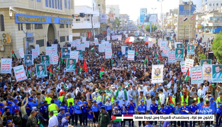 احتشد أبناء محافظة الحديدة في 27 ساحة بمركز ومديريات المحافظة في مسيرات “ثابتون مع غزة.. وسنتصدى لأمريكا ومن تورط معها”.