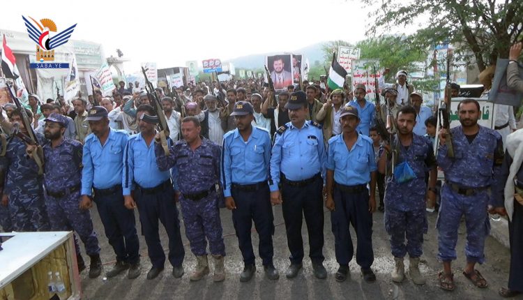 وأكد المشاركون في المسيرة بمشاركة وكيل المحافظة فيصل الفقية، ومسؤول التعبئة العامة بالمحافظة جميل الصوفي، الثبات والتفويض المطلق للقيادة الحكيمة في إسناد الشعب الفلسطيني ومحوره المقاوم في غزة.