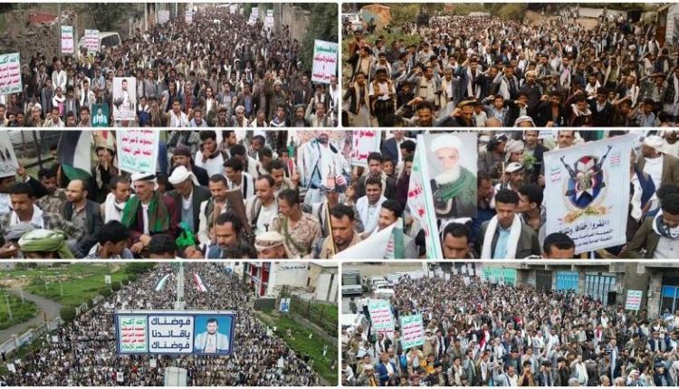 فيما احتشد أبناء مديريات المربع الغربي في مسيرات جماهيرية بمديرية العدين وعزل السارة وشلف وحردن، ومركز مديرية الفرع “الوزيرة” ومناطق المسيل والأخماس والعاقبتين والمزاحن وبني أحمد، تأكيداً على التضامن مع الشعب الفلسطيني.