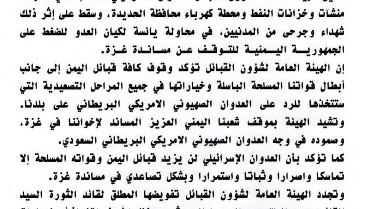 أدانت الهيئة العامة لشؤون القبائل العدوان الاسرائيلي الغاشم الذي استهدف منشآت وخزانات النفط ومحطة كهرباء محافظة الحديدة، وخلف شهداء وجرحى من المدنيين.